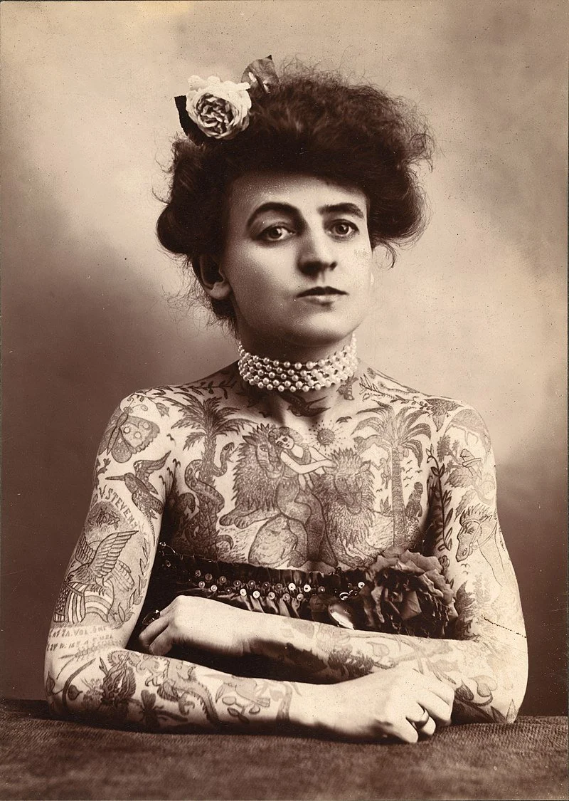 Maud was born February 12, 1877 in Emporia Kansas. By the early 1900’s, Maud started working in a traveling circus as an acrobat, aerialist and contortionist, which would eventually lead her to St. Louis World Fair, operational from April 30th - December 1st 1904. It is during this time at the World Fair that is considered to be the most impactful moment of her career. There she would go on to meet her future husband, Gus Wagner, a renowned Tattoo Artist who claimed he was the last to only work by hand rather than use a machine, using a stick and poke method. Gus considered himself to be “The most artistically marked up man in the world” and was widely known as the “Globetrotting Tattooer''. Gus also worked as a sideshow performer, which would eventually cause Maud and Gus to meet. Some say there was a stipulation offered, tattoo lessons in return date with him; however, it is unclear if Maud insisted, or if Gus offered. Other sources argue that Maud demanded lessons for the return for said date. Either way, it is evident that he taught her how to tattoo her own body, not just the bodies of others.